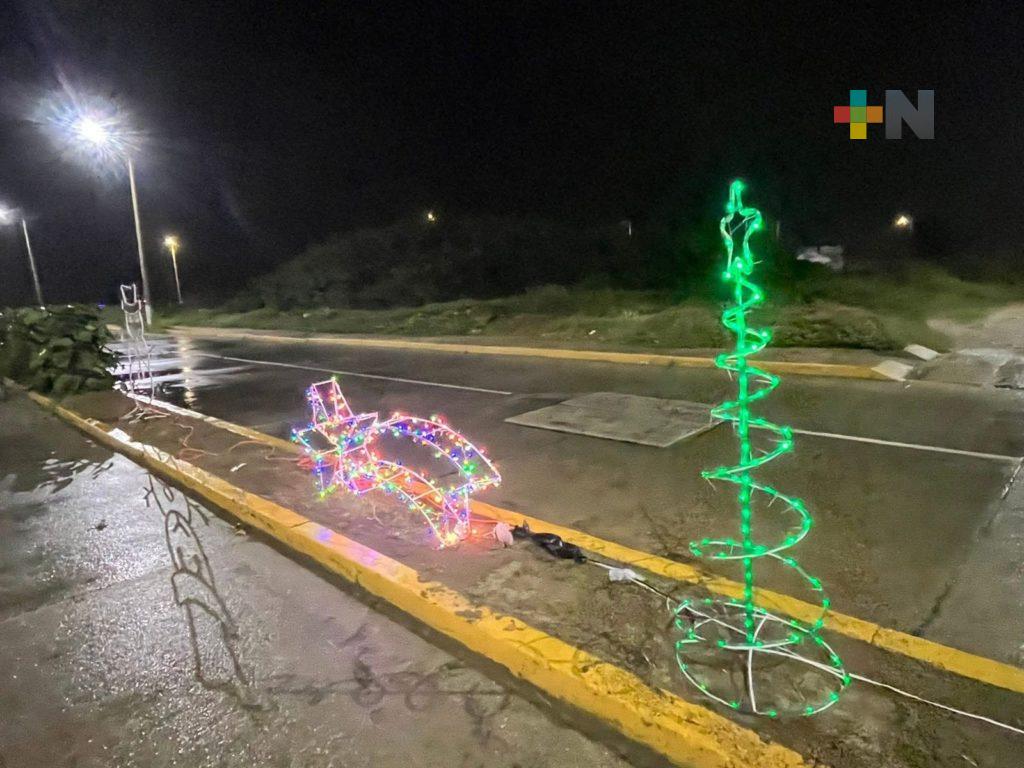 A lo largo están los pinos navideños, muñecos de nieve, estrellas fugaces, renos, Santa Claus, árboles con espirales, y en los próximos días un nacimiento.