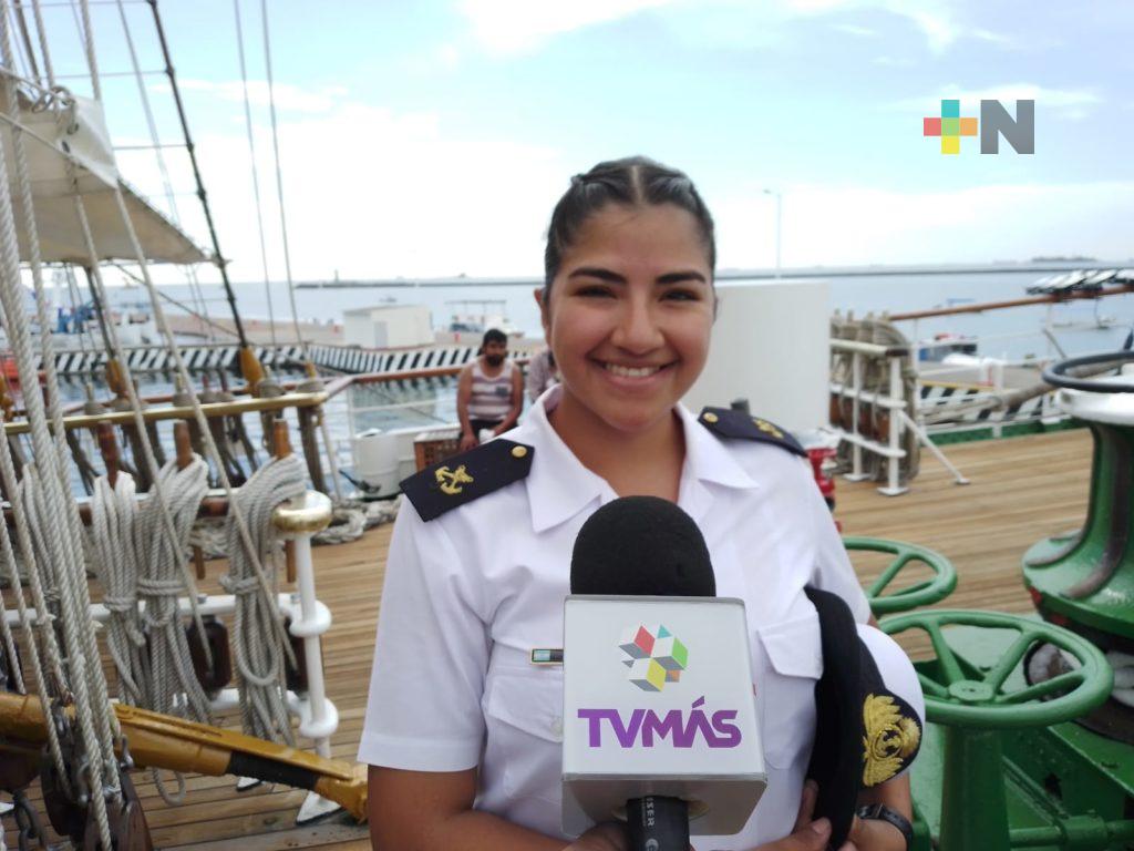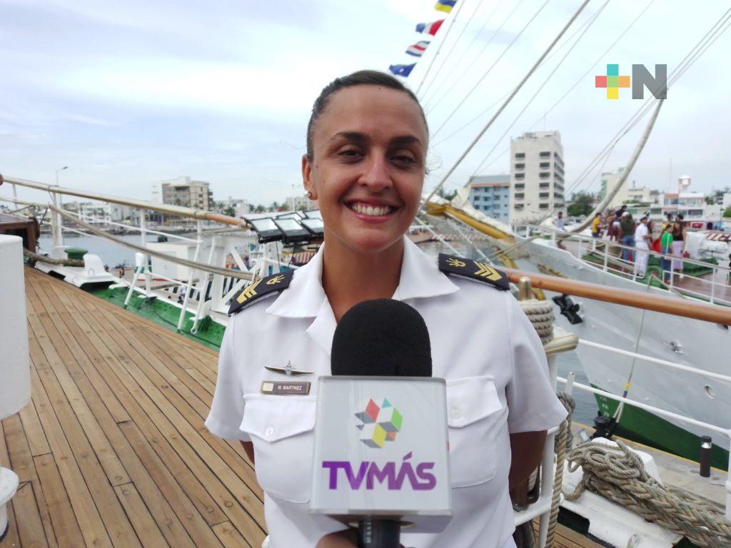 Melina Martínez, cabo Primero Comunicaciones del velero Libertad de Argentina, explicó que gracias a la influencia de su padre, quien es un marino retirado, decidió hacer una carrera en la Marina, y aunque fue difícil adaptarse a ciertas cosas, propias de la labor, considera que es una experiencia única laborar en el mar.