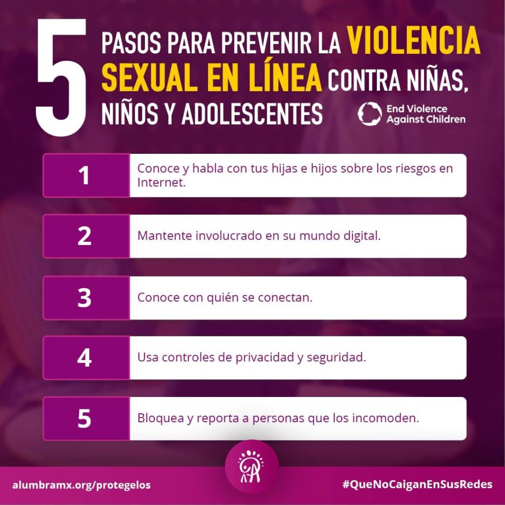 “1 Conoce y habla con tus hijas e hijos sobre los riesgos en internet, 2 mantente involucrado en su mundo digital, 3 Conoce con quienes se conectan tus hijos, 4 Usa controles de privacidad y seguridad, casi todos los dispositivos tienen controles parentales para los videojuegos y número 5.- Bloquea y reporta a personas que los incomoden”.