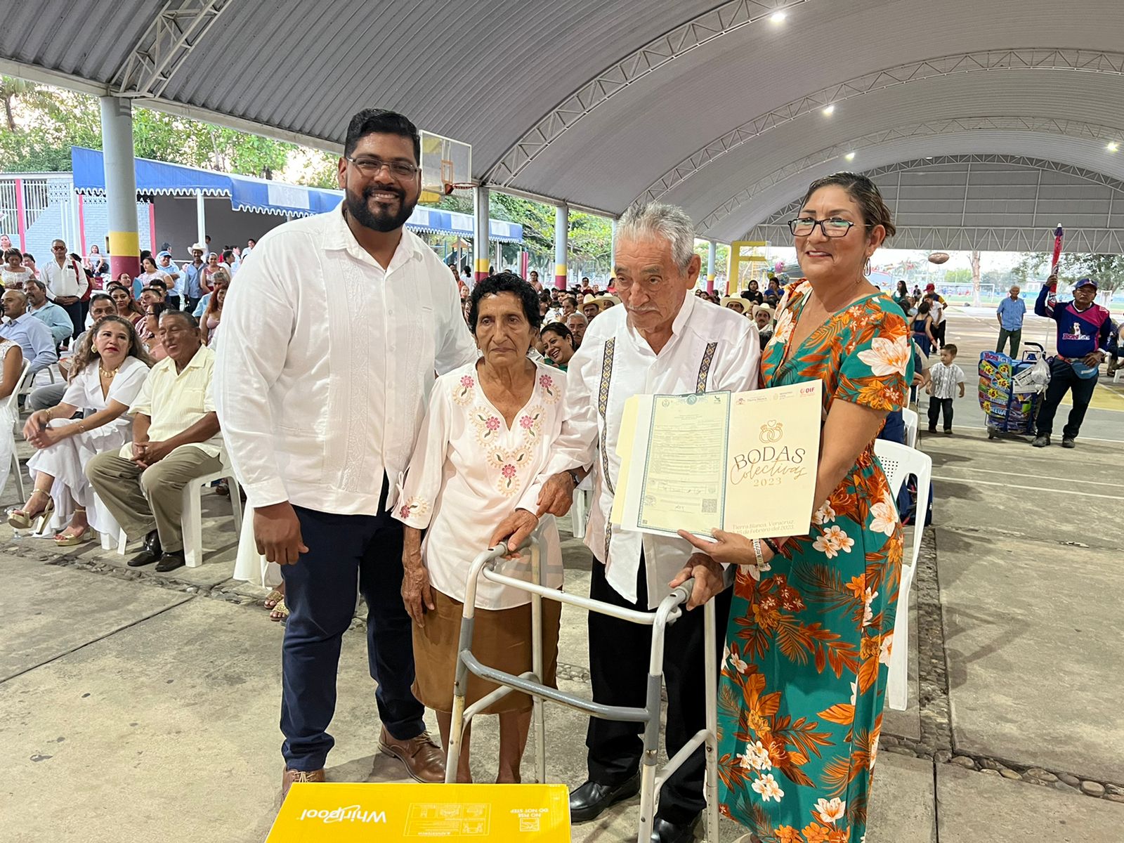 Y fue muy emotiva la ceremonia de bodas colectivas, para una pareja que llevaba 50 años viviendo en unión libre, que por fin pudieron legalizar su relación, lo que les dará una certeza jurídica a sus descendientes, y pues la administración municipal entregó regalos, refrigerio y pastel, brindando todos por la felicidad eterna para los ahora recién casados.