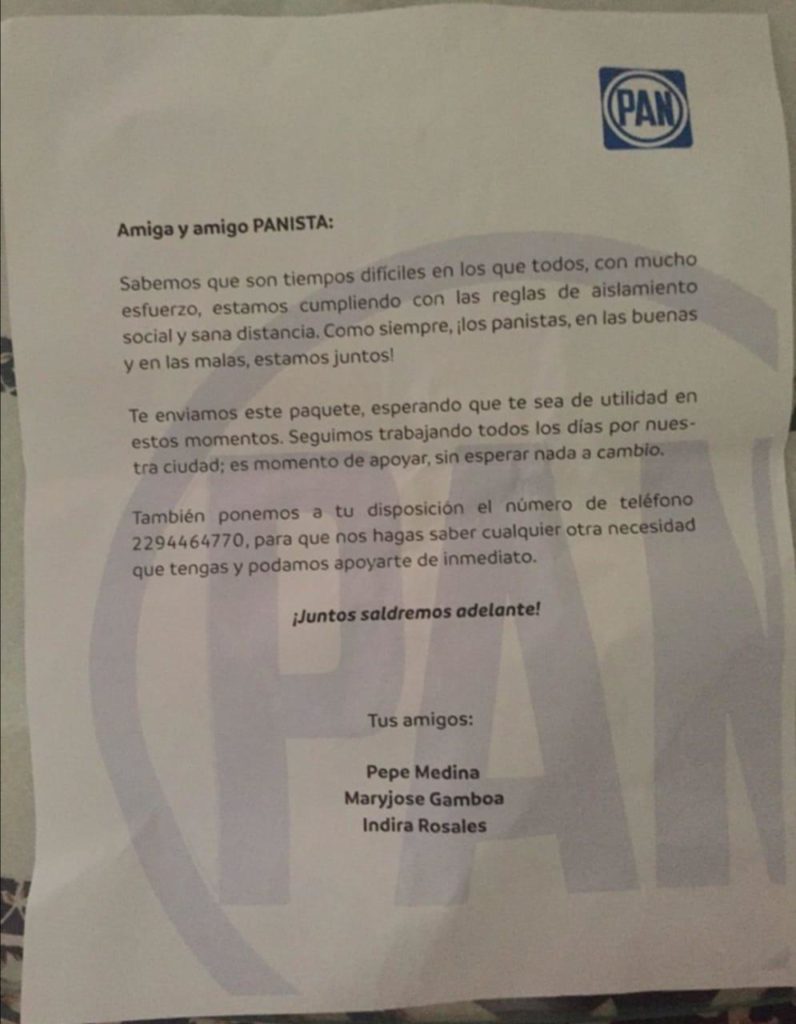 De cara al proceso electoral del 2021y en su interés por sacar provecho político, han empezado a lucrar con la situación actual al hacer entrega, en forma selectiva, de despensas a simpatizantes del Partido Acción Nacional en esta ciudad.