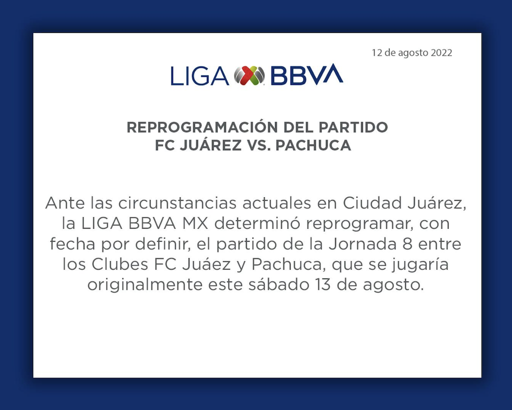 Redacción.- Es oficial. Debido a que las condiciones de seguridad de la plaza de Ciudad Juárez, Chihuahua no son propicias, la Liga MX informa que el duelo que debían de jugar este fin de semana los equipos FC Juárez y Pachuca no se realizará y será reprogramado.