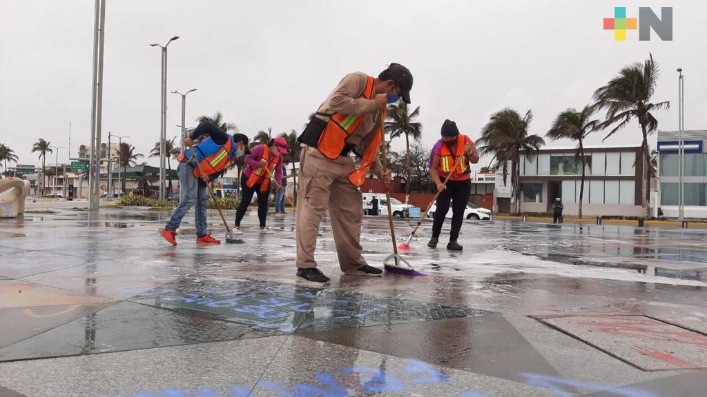 Limpiaron explanada del asta bandera donde grupos feministas se manifestaron en Veracruz
