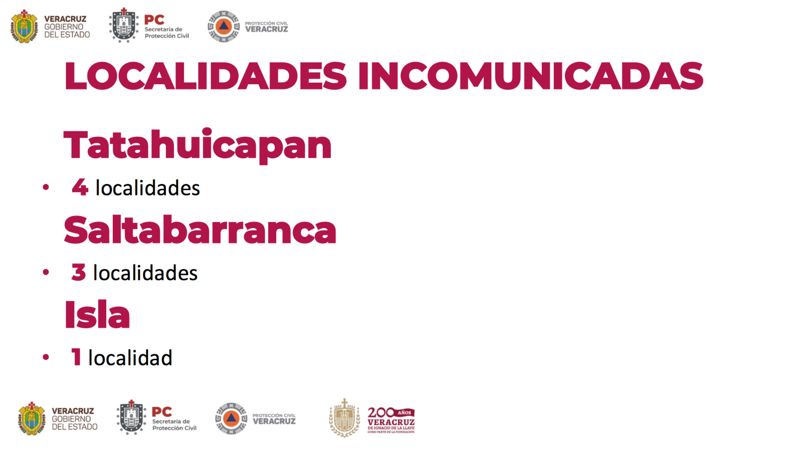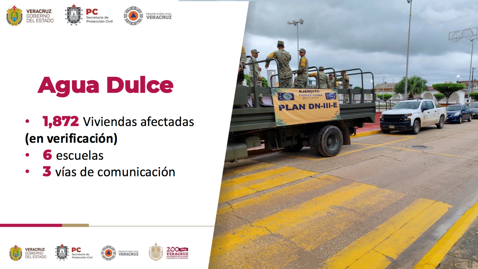 El Gobernador reiteró que permanecen los planes Tajín, DN-III-E y Marina en 20 municipios, principalmente los referidos, mientras que la Secretaria de PC estará en territorio manteniendo comunicación con las fuerzas federales, autoridades estatales y direcciones municipales de Protección Civil, además del secretario de Gobierno, Carlos Alberto Juárez Gil, que se trasladó a Los Tuxtlas.