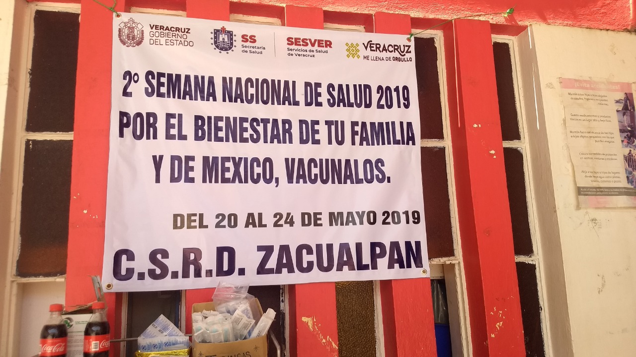 Zacualpan, Ver.- Con avance del 90 por ciento de 1,774 personas en 13 localidades y la cabecera municipal de Zacualpan, se lleva a cabo la Segunda Semana Nacional de Salud, señaló María de Jesús Lechuga Ibarra, enfermera del Centro de Salud Rural Disperso, (CSRD).