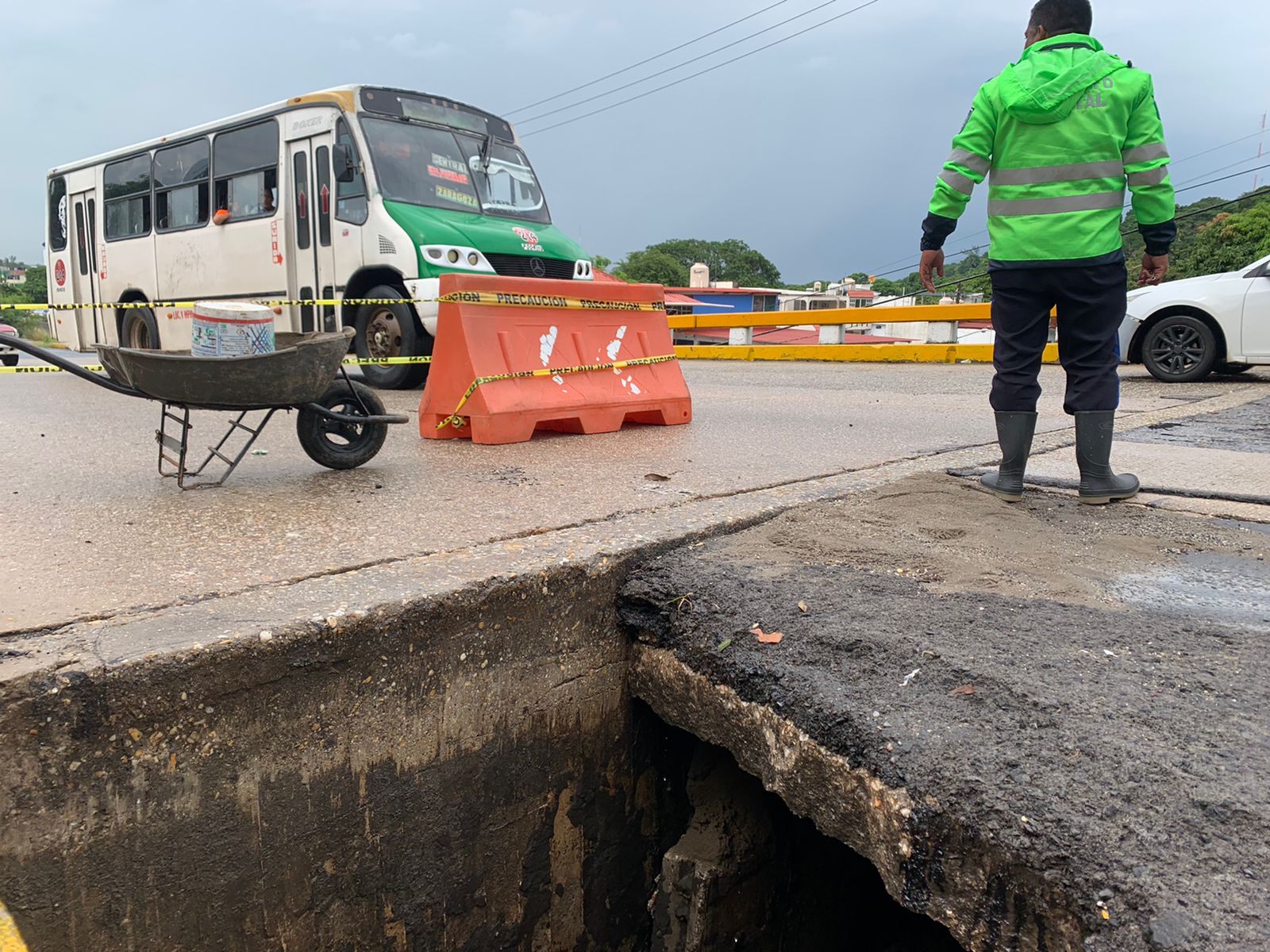 Al lugar acudió Protección Civil para acordonar la zona y evitar cualquier incidente; Tránsito del estado también agilizó la vialidad, además Obras Públicas a través de servicios públicos municipales llegó a remediar el hueco que por tercera ocasión se deslava.
