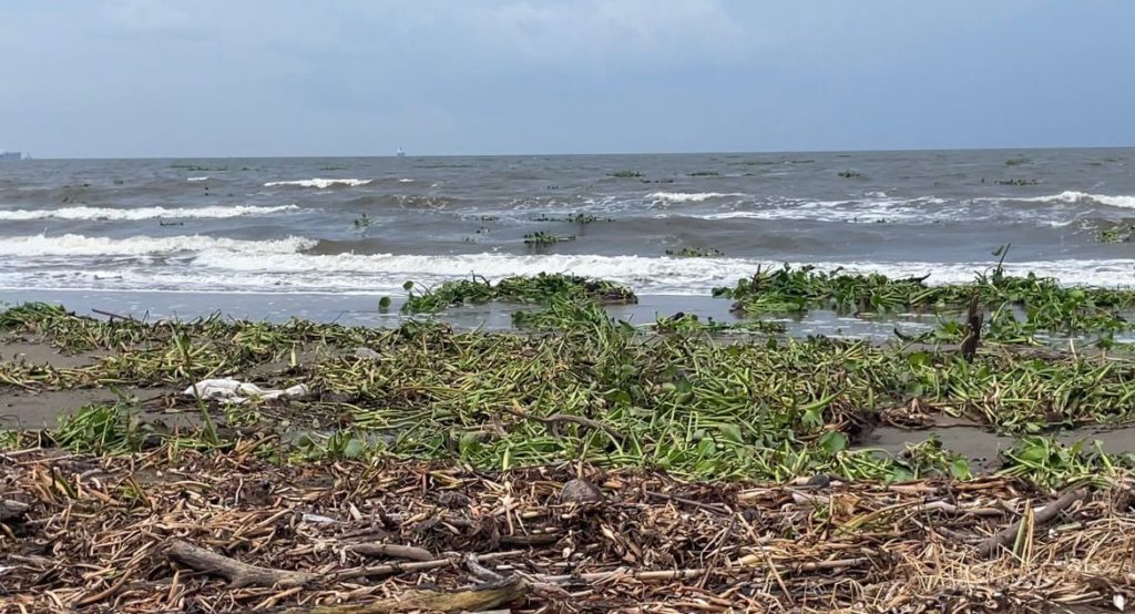 Lluvias en Coatza han generado gran cantidad de lirio, habitual en río, que ahora llega a playa
