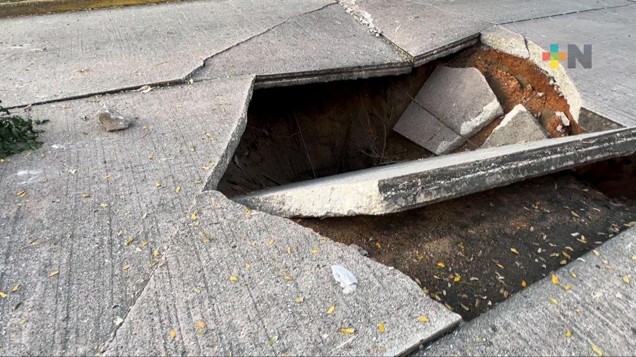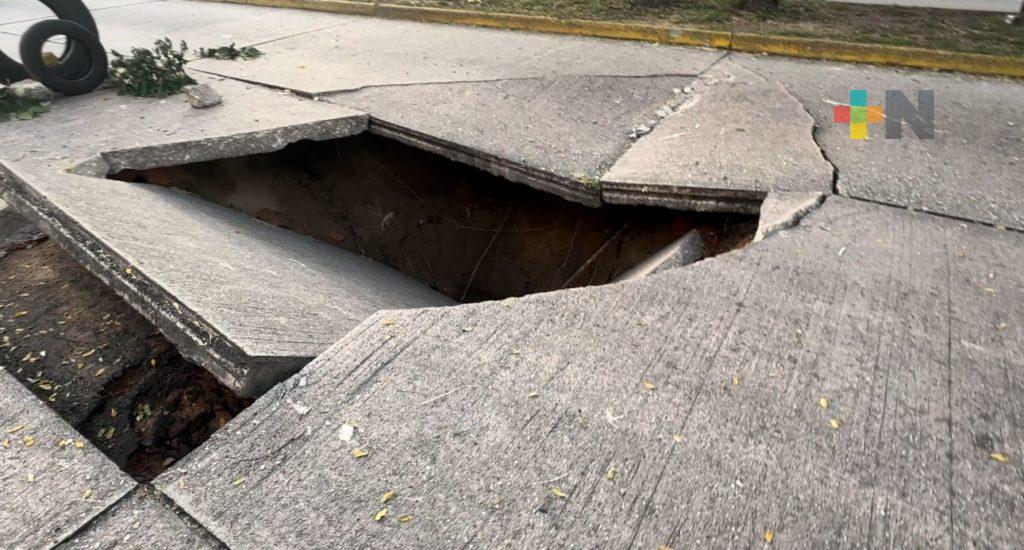 Lluvias y deterioro en sistema de drenaje forma socavón en colonia de Coatza