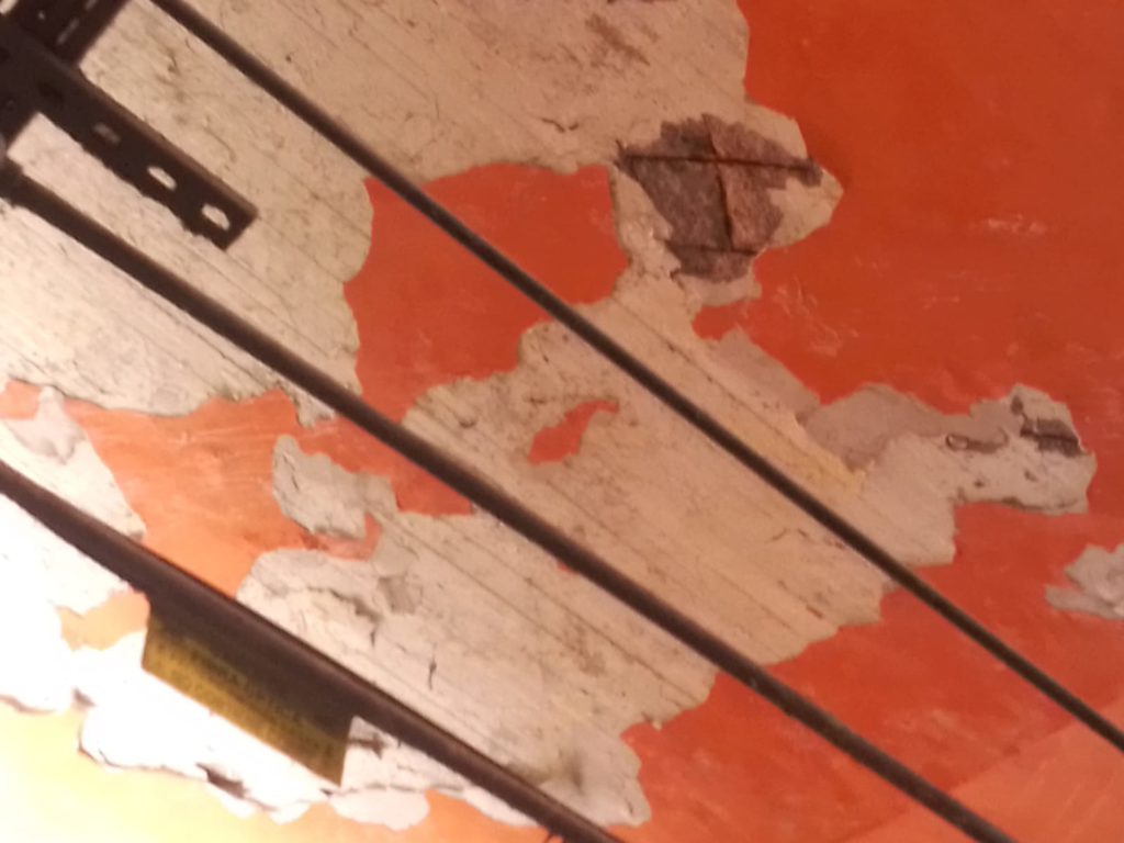 Sumado a lo anterior, una cornisa que está por fuera, también está dañada y cayéndose pieza por pieza, a riesgo de caerle encima a alguien.