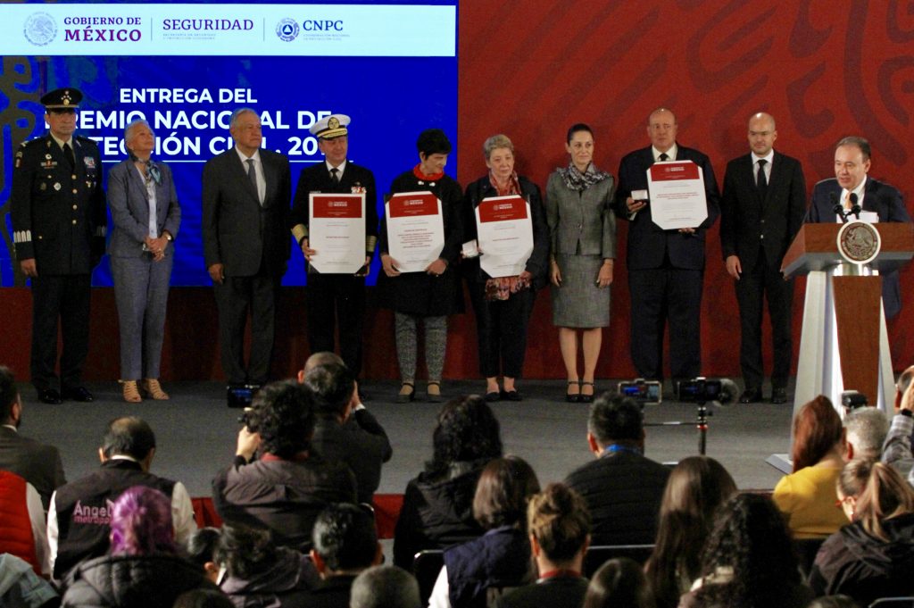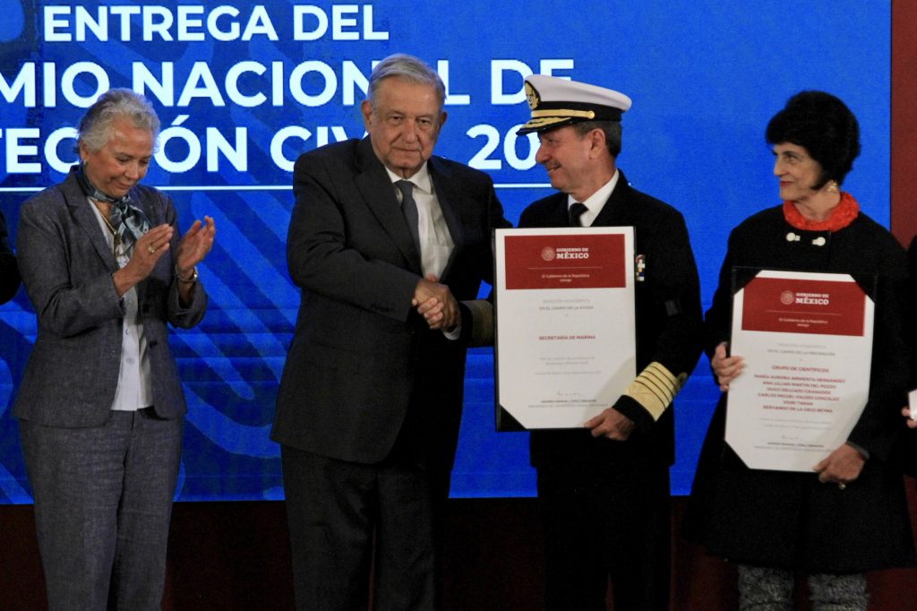 México.- El presidente Andrés Manuel López Obrador entregó el Premio Nacional de Protección Civil en los campos de Prevención y de Ayuda, así como una mención honorífica y un reconocimiento a la Secretaría de Marina-Armada de México (Semar) por la creación del Sistema de Búsqueda y Rescate (SBR).