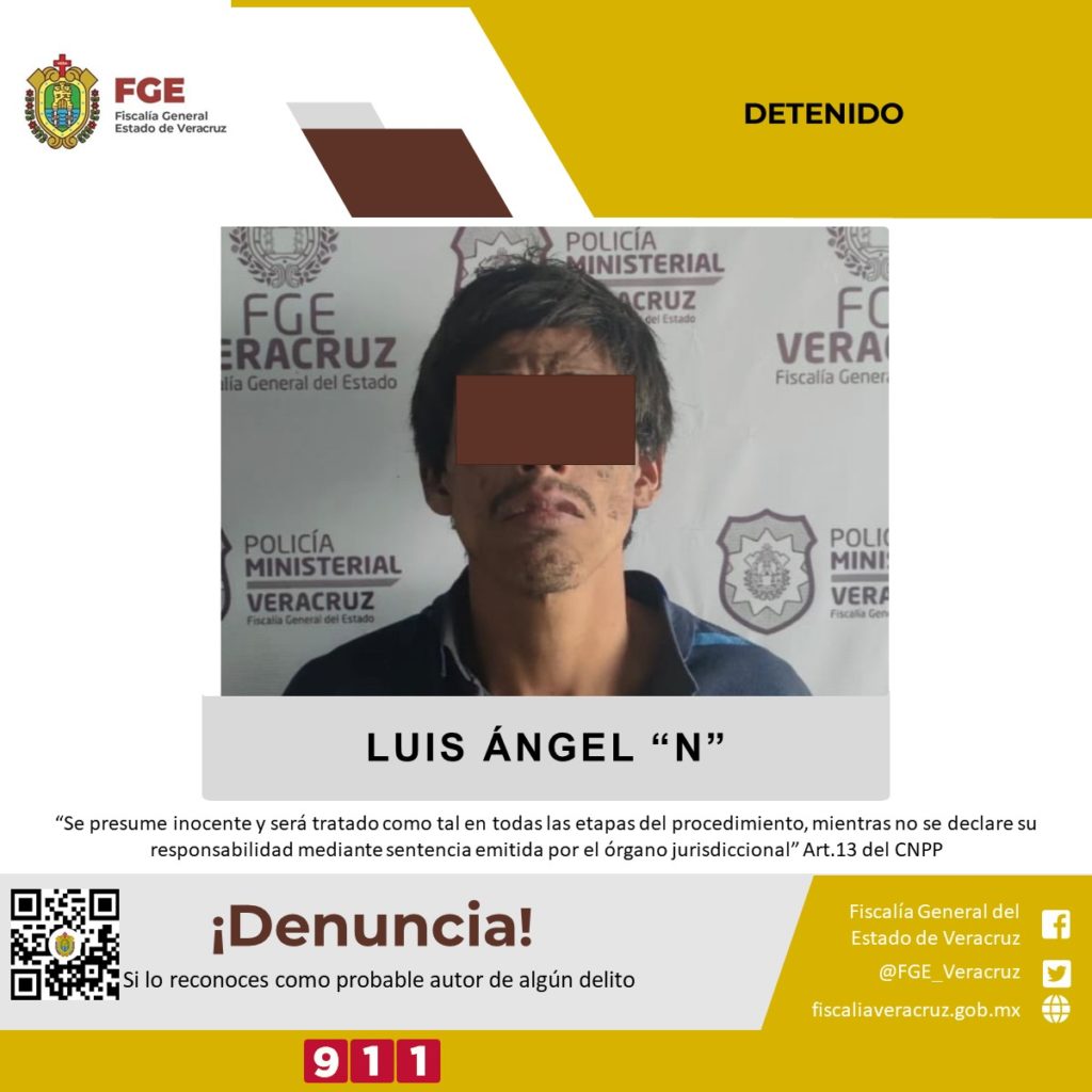 Xalapa, Ver.- La Fiscalía General del Estado informa que elementos de la policía ministerial detuvieron a Luis Ángel “N”, presunto responsable de los homicidios de una mujer y un menor de edad, ambos de identidad resguardada, hechos suscitados el lunes 4 del presente mes y año en la ciudad de Orizaba.