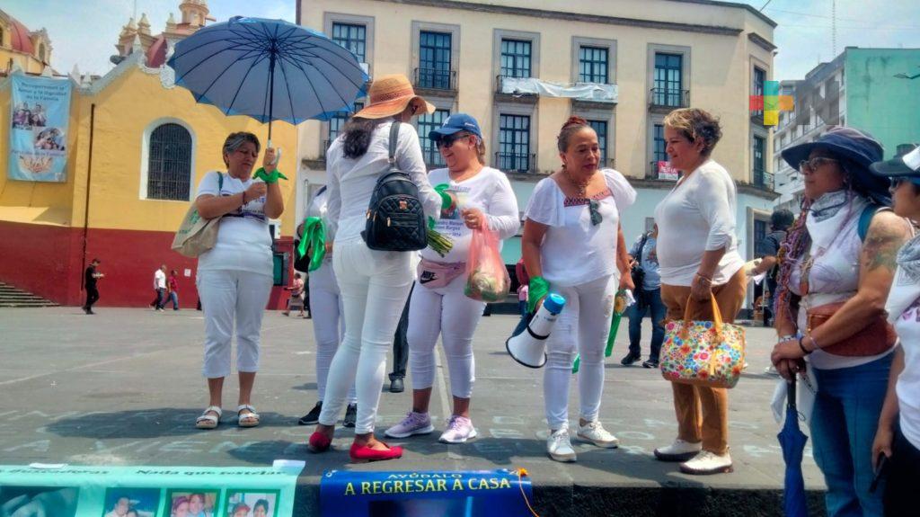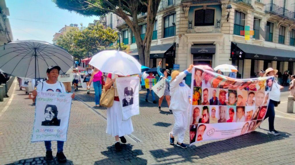Xalapa, Ver.- En silencio, vestidas de blanco y sosteniendo las fichas con las fotografías de sus hijas e hijos desaparecidos, madres que integran distintos colectivos de búsqueda marcharon por las calles del centro de Xalapa, así expresaron su dolor y esperanza de encontrar con vida a quienes les dieron la dicha de ser madres.