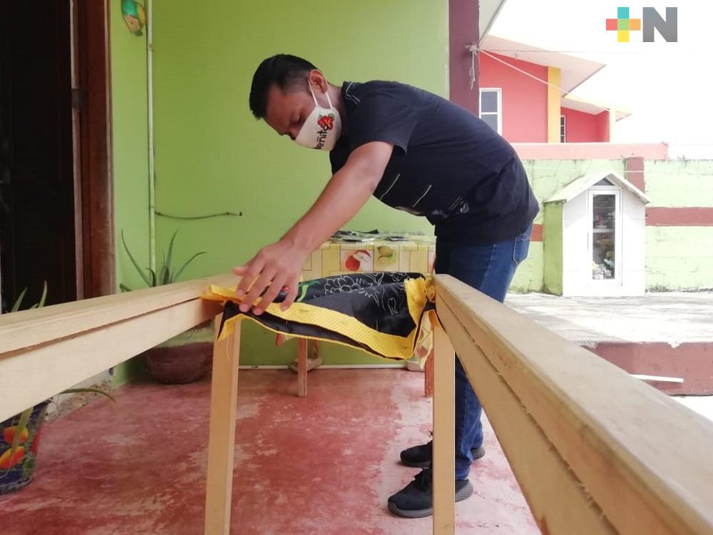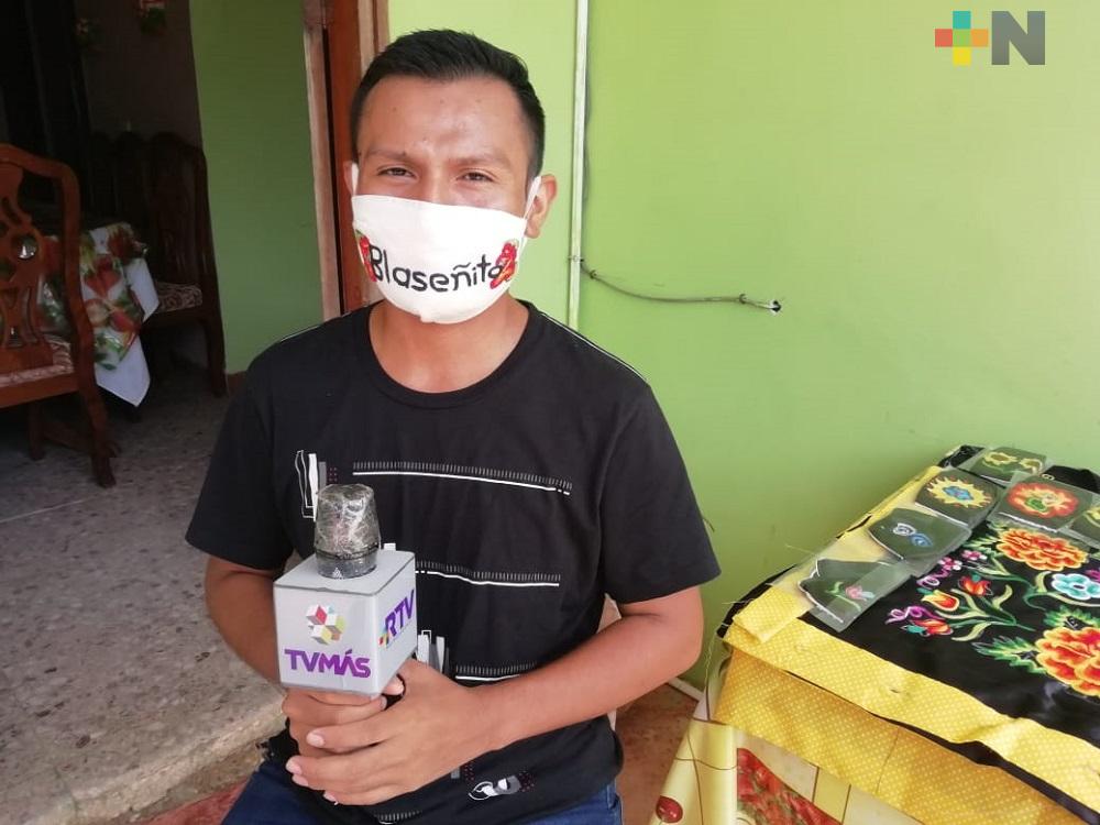 Coatzacoalcos, Ver.- Desde que inicio la pandemia de COVID-19, el maestro de danza y artes Crispín López decidió tejer cubrebocas artesanales con figuras originales de su natal Oaxaca, que comercializa entre la población de Coatzacoalcos.