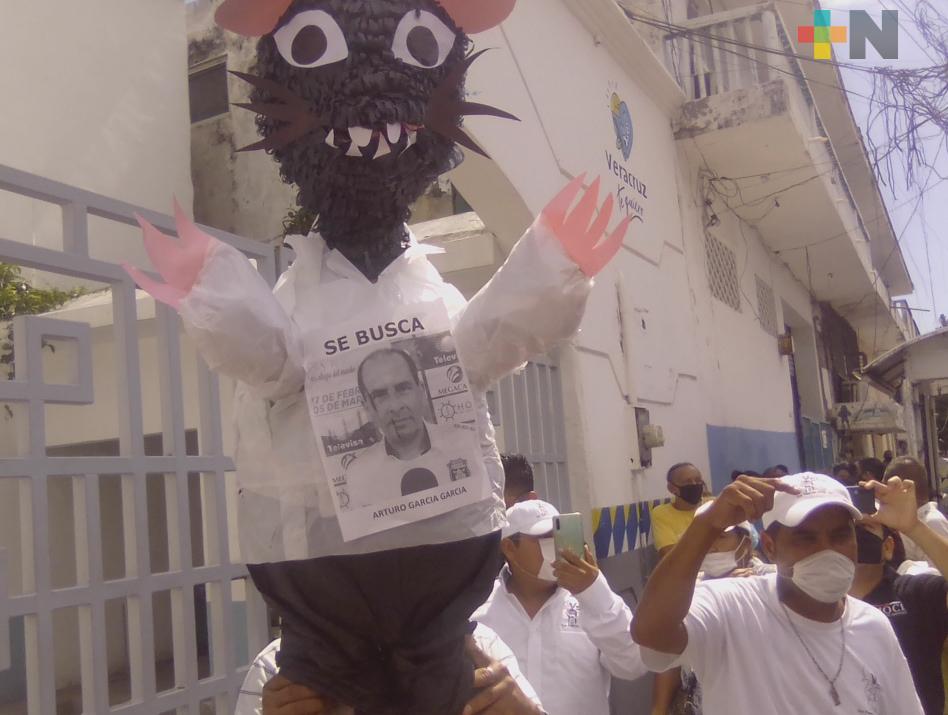 Con papeles con la cara del director de Tránsito municipal Arturo García en la piñata con forma de rata marcharon desde el parque Siriaco Vázquez hasta la entrada de las instalaciones de tránsito, exigieron que se acabe la corrupción que acusan promueven el alcalde de Veracruz y el director de tránsito municipal o habrá más denuncias en la Fiscalía Anticorrupción en contra de los dos.