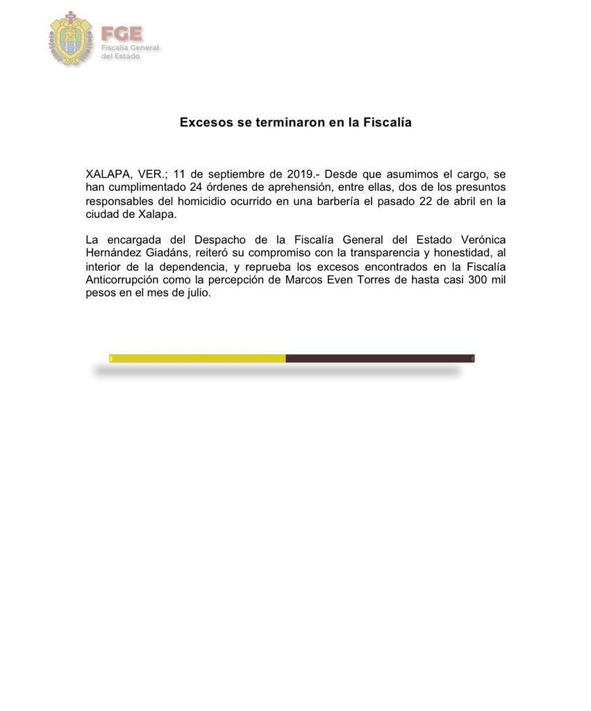 Xalapa, Ver.- La encargada del despacho de la Fiscalía General del Estado, Verónica Hernández Giadáns, reprobó los excesos encontrados en la Fiscalía Especializada en Combate a la Corrupción, como por ejemplo la percepción que tenía Marcos Even Torres de hasta casi 300 mil pesos en el mes de julio.