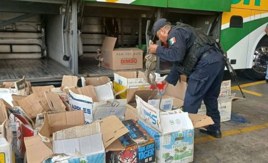 Al inspeccionar el área de equipaje, los agentes localizaron a los ejemplares dentro de cajas de cartón, en condiciones de hacinamiento y sin medidas adecuadas para su resguardo, lo que confirmó el traslado ilegal de los reptiles.