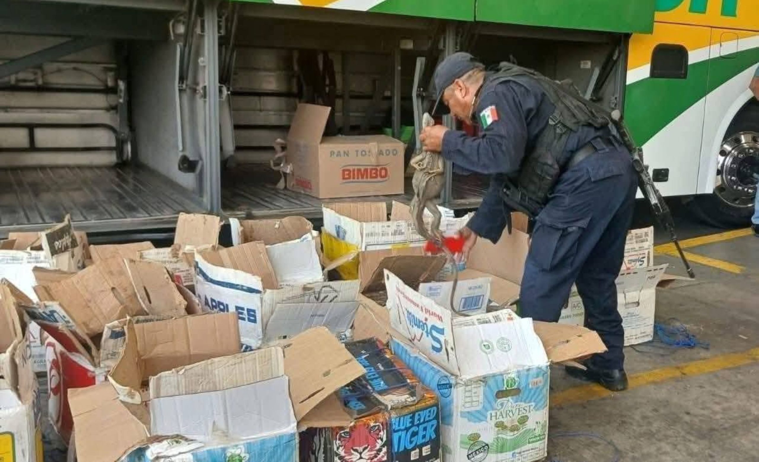 La intervención se realizó en la terminal de autobuses de esa localidad, donde personal de la Procuraduría Federal de Protección al Ambiente (Profepa), con apoyo de elementos de la Secretaría de la Defensa Nacional (Sedena), la Secretaría de Marina (Semar) y la Policía Estatal, inspeccionó una unidad de la línea Sur.