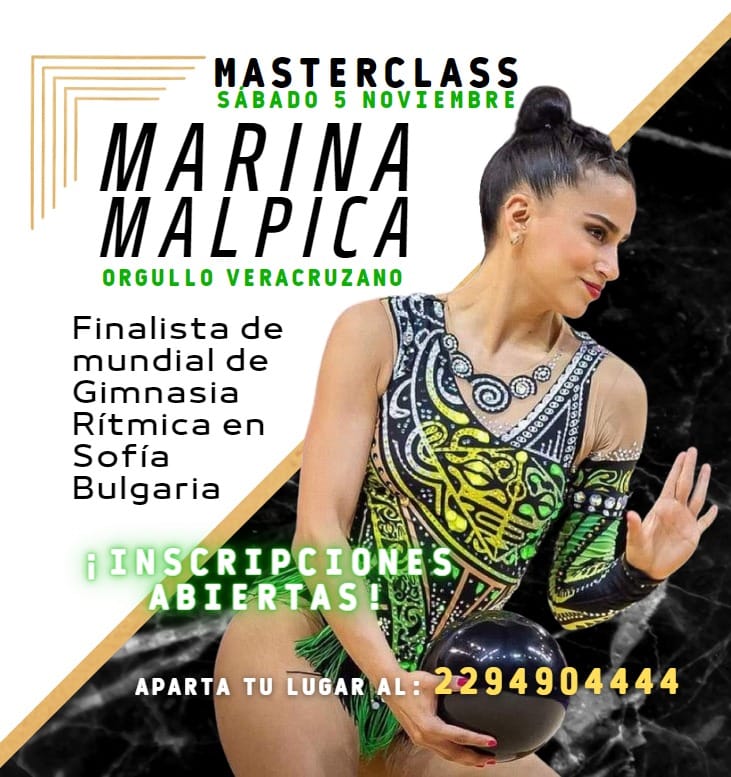 Veracruz, Ver.– La organización de Gimnasia Rítmica Club de Oro anuncia la realización de una Master Class por parte de la seleccionada nacional y embajadora internacional dorada, Marina Malpica Ramírez el próximo 5 de noviembre.