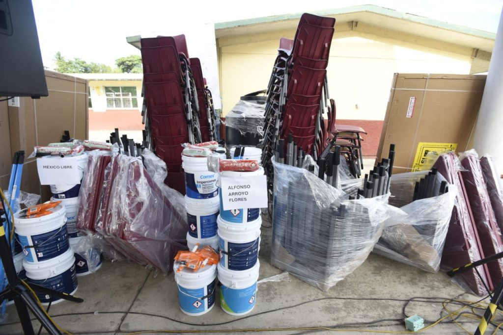 En esta ocasión, 10 primarias del sistema federal de la región del Papaloapan recibieron mil 976 litros de pintura, 224 sillas, 110 mesas trapezoidales, 48 pizarrones blancos, 156 cubetas de impermeabilizante y dos kits hidrosanitarios.