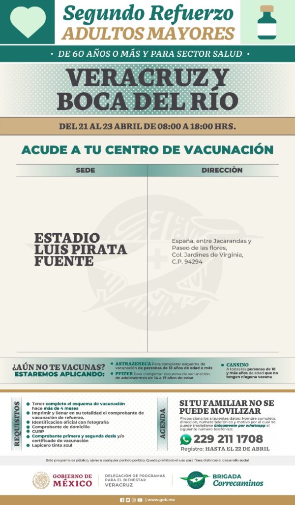 Veracruz, Ver.- Adultos mayores de 60 años recibirán el segundo refuerzo de la vacuna contra el Covid-19, informó el delegado de programas sociales, Manuel Huerta Ladrón de Guevara.