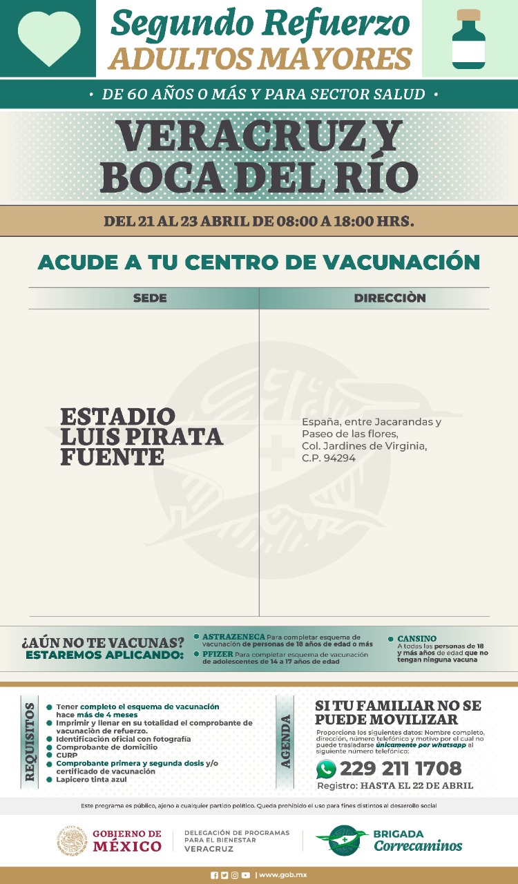En la zona conurbada la aplicación de la segunda dosis de refuerzo se llevará a cabo del 21 al 23 de abril en el estadio Luis Pirata de la Fuente, en horario de 8:00 a 18:00 horas.
