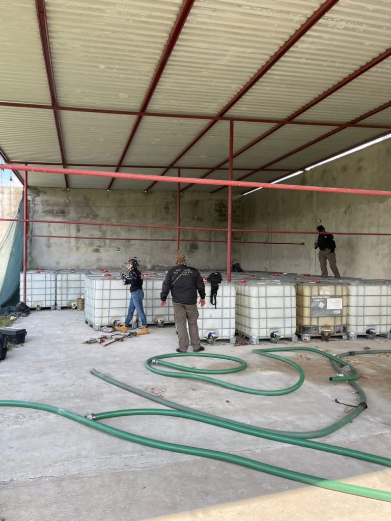 En el lugar inspeccionado, los elementos federales en compañía de Peritos de la Institución expertos en la materia, aseguraron 12 mil 387 litros de hidrocarburo, 55 contenedores de plástico con arnés metálico, una camioneta con caja seca y placas de circulación del estado de Veracruz, manguera de alta presión de color verde, así como diversas garrafas y cubetas de diversas capacidades.