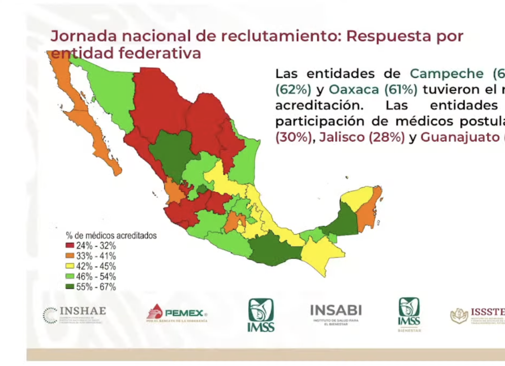 “Esta jornada nacional de reclutamiento lleva el registro de 10 mil 920 médicos y médicas, 6 mil 229 no acudieron a la cita, el 57 por ciento; 4 mil 494 médicas y médicos fueron acreditados, el 41 por ciento pasaron a la siguiente etapa; y sólo un dos por ciento, menos de 200 médicos, no acreditaron su especialidad y desde luego esto está pendiente”, dijo el funcionario federal del sector salud.