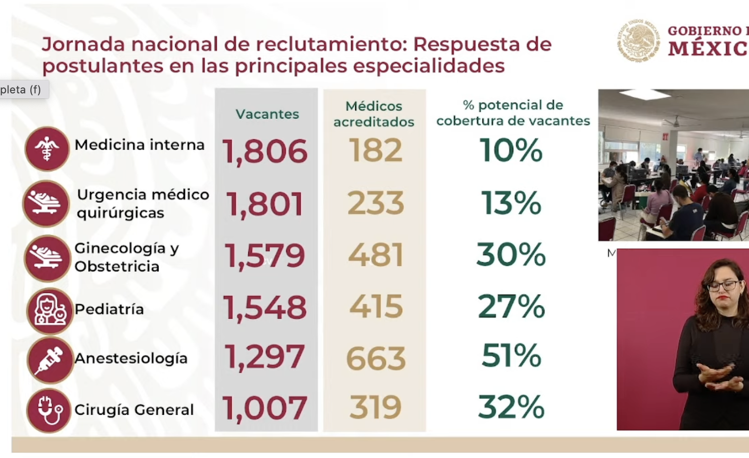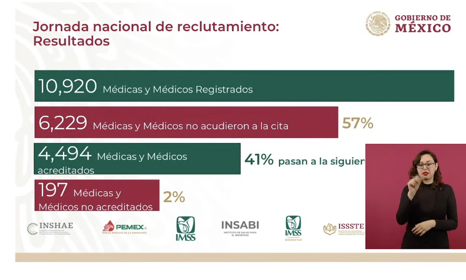 “Esta jornada nacional de reclutamiento lleva el registro de 10 mil 920 médicos y médicas, 6 mil 229 no acudieron a la cita, el 57 por ciento; 4 mil 494 médicas y médicos fueron acreditados, el 41 por ciento pasaron a la siguiente etapa; y sólo un dos por ciento, menos de 200 médicos, no acreditaron su especialidad y desde luego esto está pendiente”, dijo el funcionario federal del sector salud.