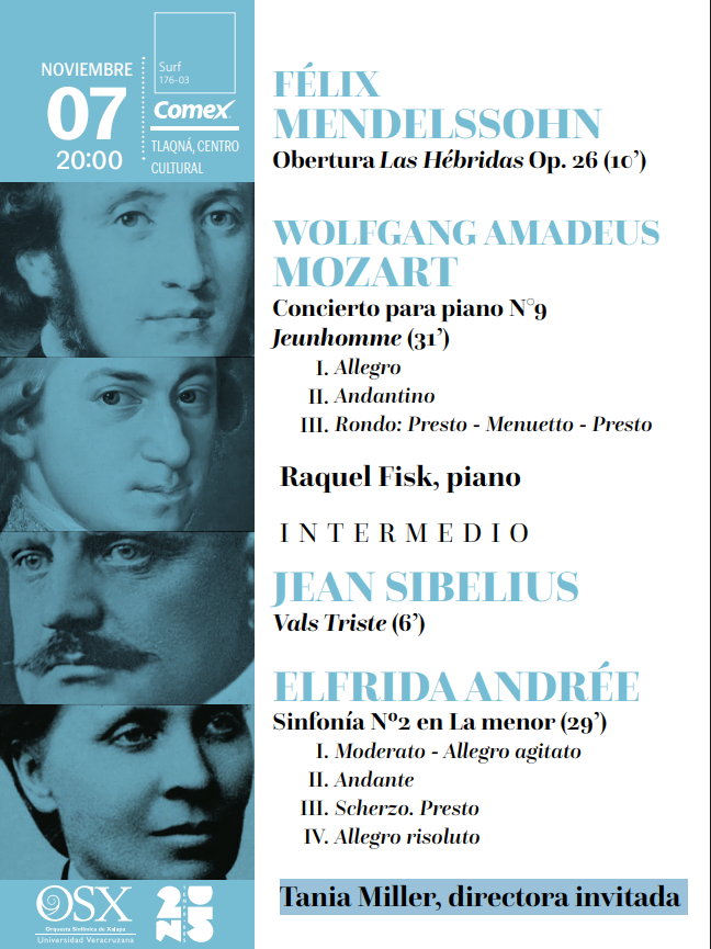 Xalapa, Ver.- “Las Hébridas”, obertura Mendelssohn; el Concierto para piano N° 9 “Jeunehomme” de Mozart; la sinfonía en La menor de Andrée y el “Valse triste” de Sibeliusson parte del programa que la Orquesta Sinfónica de Xalapa presentará el viernes 7 de noviembre en punto de las 20 horas en la sala Tlaqná Centro Cultural.