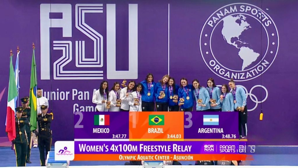 La actividad femenil continuó y la natación tricolor se estrenó en Paraguay con un metal de plata en la prueba relevo femenil 4x100m, pues Celia Pulido, Fernanda Elizondo, María Fernanda Méndez y Valeria Villarreal, lograron el segundo sitio con un tiempo de 3:47.77 minutos.