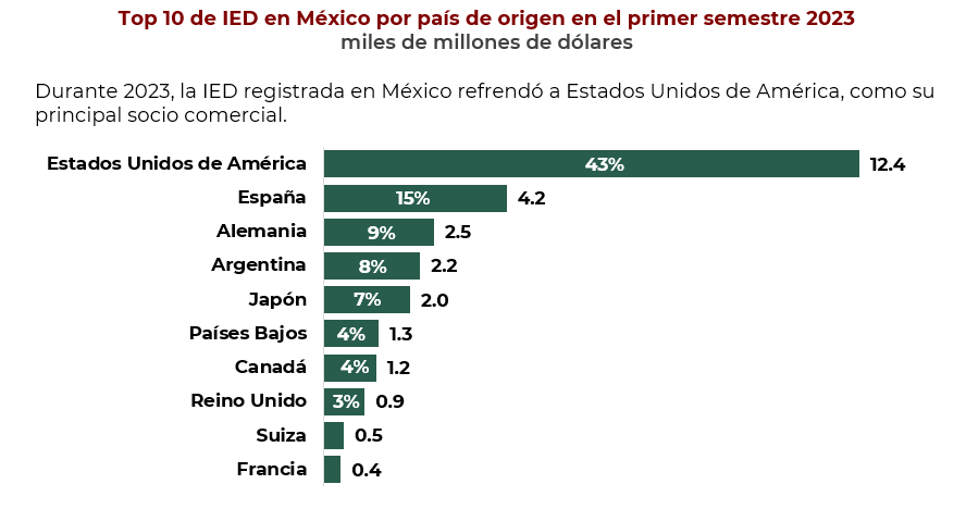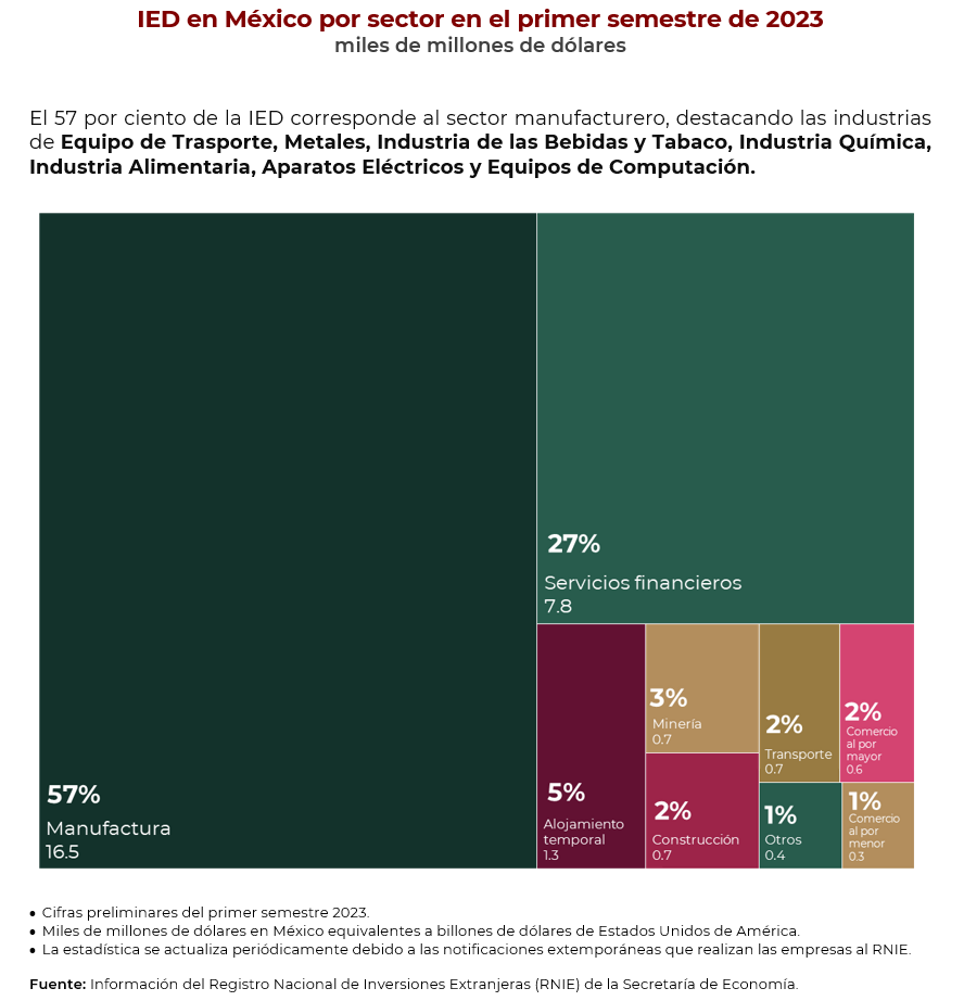 México recibió 29 mil mdd de Inversión Extranjera Directa durante primer semestre de 2023
