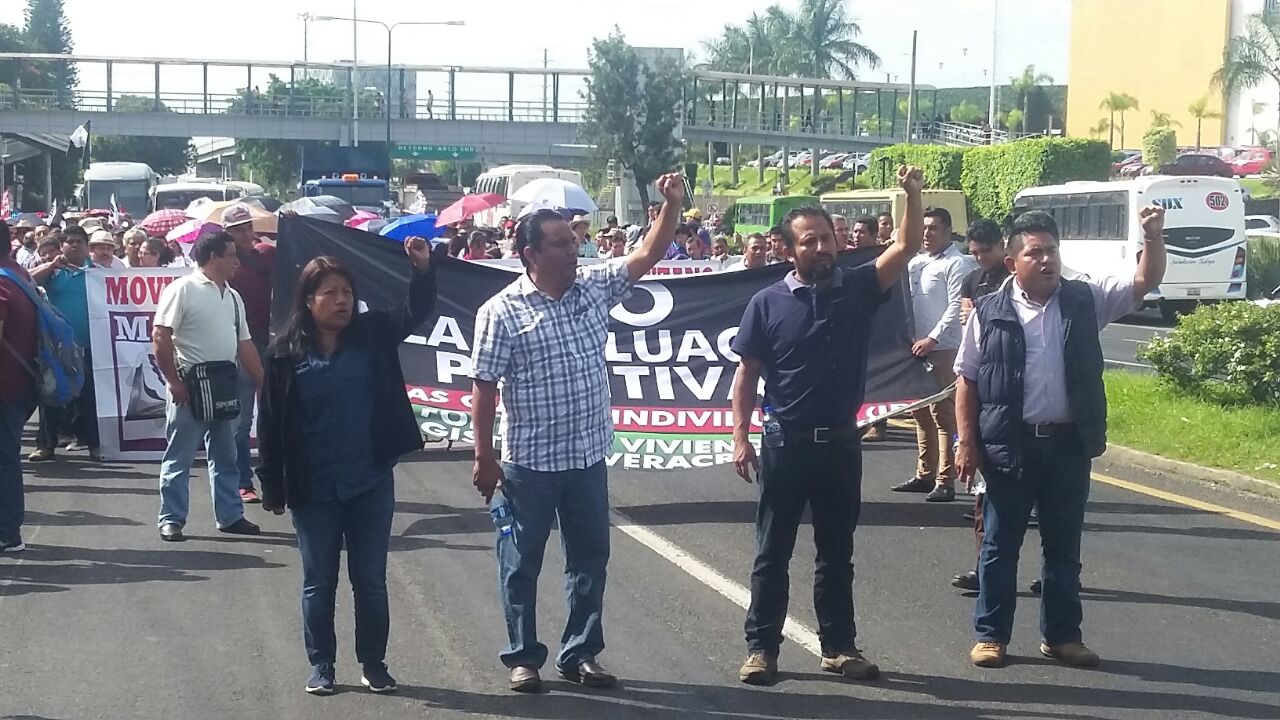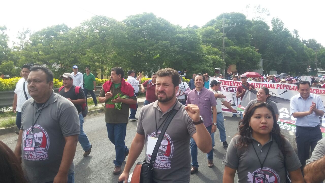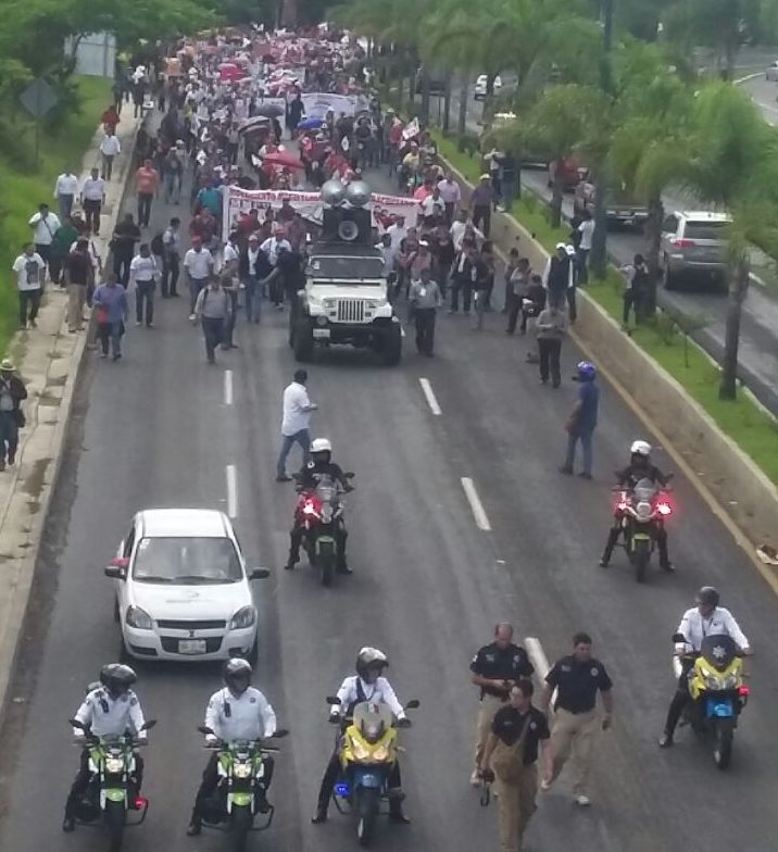 En la movilización convocada por el Movimiento Magisterial Popular Veracruzano (MMPV) y la Coordinadora Nacional de Trabajadores de la Educación (CNTE) participaron maestros de Guerrero, Chiapas, Oaxaca y Veracruz, quienes caminaron por la avenida Lázaro Cárdenas, escoltados por elementos de Seguridad Pública y Tránsito.