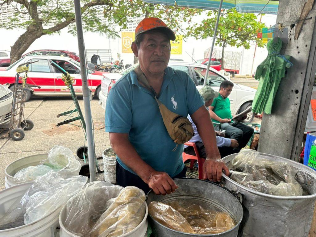 Don Agapito Sánchez lleva 16 años llegando desde Sayula de Alemán desde donde sale a las 5 de la mañana para llegar a vender sus tamales en la zona campesina del mercado a partir de las 6 de la mañana.