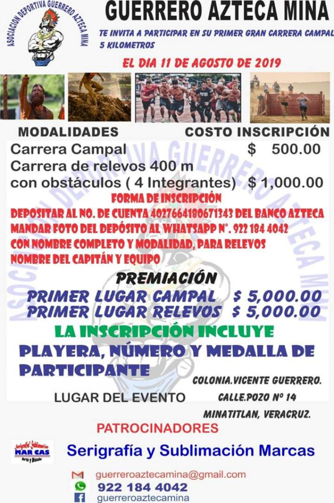 Coatzacoalcos, Ver.- El próximo 11 de agosto se llevará a cabo en Minatitlán, la carrera con obstáculos «Guerrero Azteca Mina», evento organizado por la asociación deportiva con el mismo nombre en la que se espera la participación de al menos 500 atletas, quienes competirán en las modalidades campal que constará de 5 kilómetros y relevos de 400 metros, informó Juan Carlos Demetrio, parte del grupo coordinador.