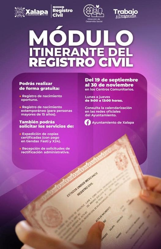 Con el propósito de abatir el rezago de registros de nacimiento ocasionado por la pandemia de Covid-19, la oficina del Registro Civil en Xalapa estará acudiendo a los centros comunitarios de la Dirección de Desarrollo Social del ayuntamiento de Xalapa, en horario de 9 a 13 horas, informó José Luis Martínez Corona, oficial del Registro Civil.