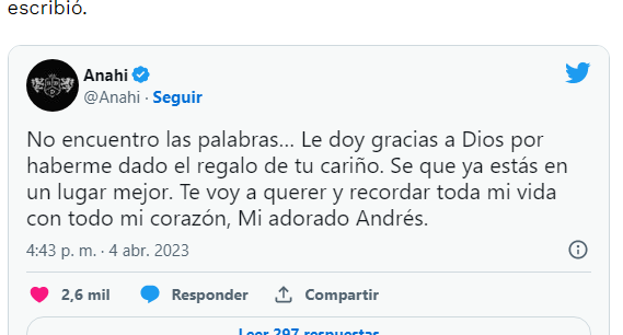 «No encuentro las palabras… Le doy gracias a Dios por haberme dado el regalo de tu cariño. Se que ya estás en un lugar mejor. Te voy a querer y recordar toda mi vida con todo mi corazón, Mi adorado Andrés», escribió.