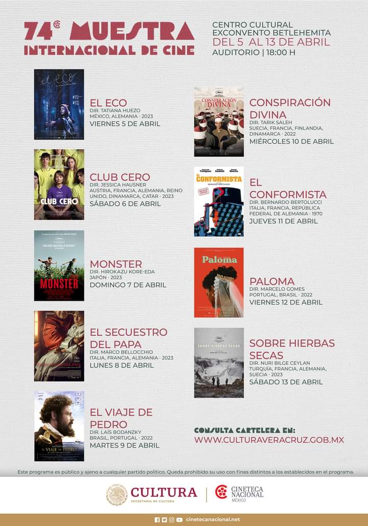 Veracruz, Ver.- Del 5 al 13 de abril, la Secretaría de Cultura del estado, en coordinación con el Exconvento Betlehemita, presentará la 74 Muestra Internacional de Cine de la Cineteca Nacional.