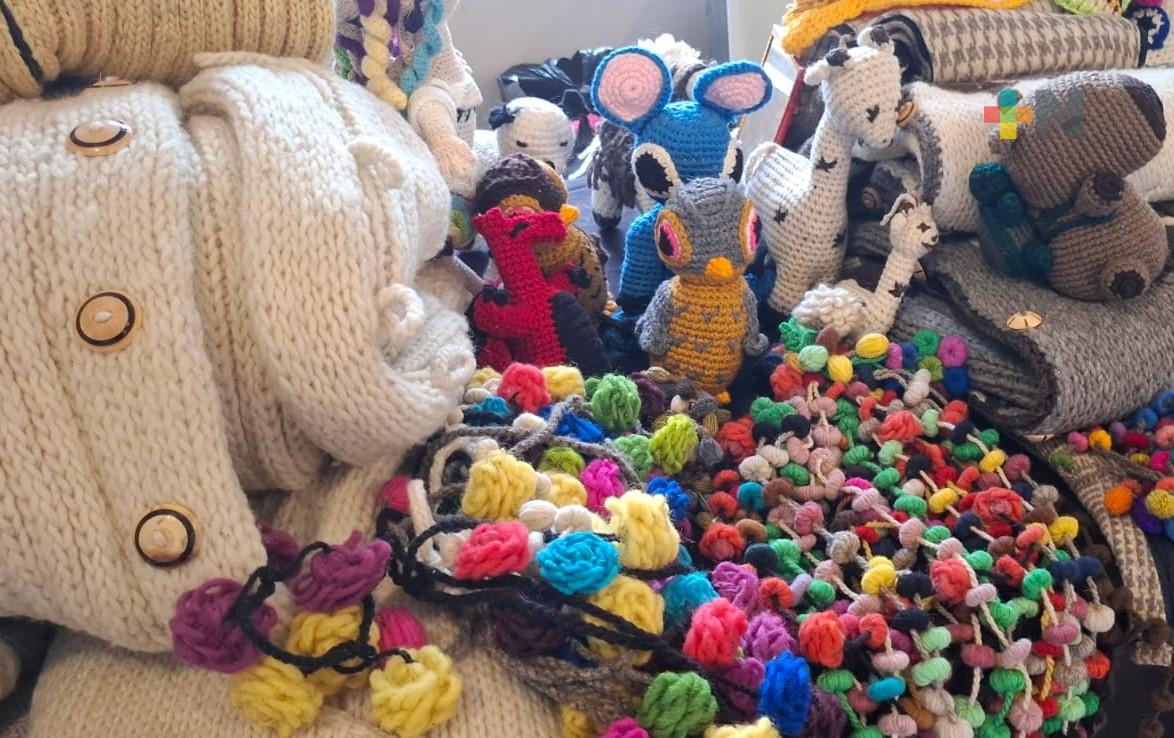“Es textil de lana de borrego. Hacemos los rebosos, traemos quechquémitl, bufandas. Son tejidos en telar de cintura. Estos gorros son tejidos a gancho o las figuritas. Son diferentes tejidos, también traemos los tlapiales que son para el cabello o collares. Utilizamos los tintes naturales que recolectamos en nuestras localidades para sacar los colores. Por ejemplo, la flor de dalia, grana cochinilla, hay otros que se buscan en el monte, con flores de temporada”, señaló Modesta Abelin Guadalupe, artesana de Zongolica.