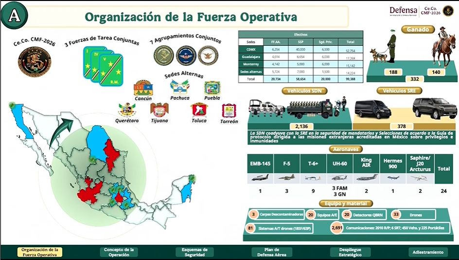 “Se autorizó la creación de tres fuerzas de tarea conjunta, una por cada sede mundialista: Ciudad de México, Guadalajara y Monterrey, siete agrupamientos conjuntos, uno por cada sede alterna donde esperamos la concentración de selecciones para sus entrenamientos”, detalló.
