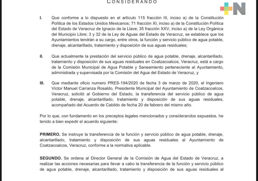 “La Comisión del Agua del Estado de Veracruz elaborará y presentará al ayuntamiento de Coatzacoalcos el programa de transferencia correspondiente con la finalidad de realizar la entrega de los servicios en los términos de la ley de la materia”, detalla el tercer punto del documento oficial.