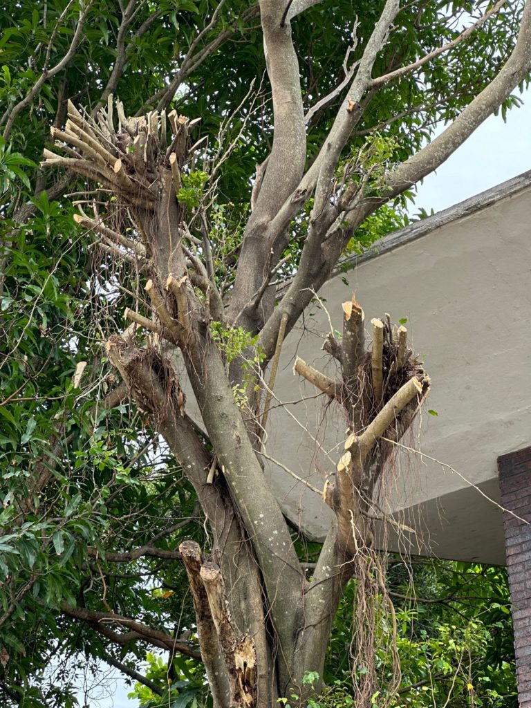 Coatzacoalcos, Ver.- Con el fin de impedir cortes bruscos de energía eléctrica y daños por caídas de ramas durante las tormentas eléctricas y lluvias, personal del gobierno de Coatzacoalcos realizó la poda preventiva de varios árboles en la avenida Román Marín a un costado de la Casa de Día del Adulto Mayor.