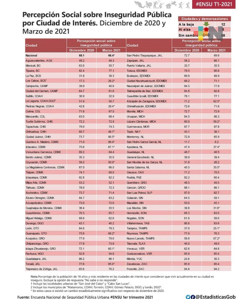 Coatzacoalcos, Ver.- De diciembre del 2020 a marzo del 2021 la percepción social sobre inseguridad pública en el municipio de Coatzacoalcos logró mejorar, abandonando la ciudad los primeros lugares dentro de la Encuesta Nacional de Seguridad Pública Urbana (ENSU) medida por el INEGI.