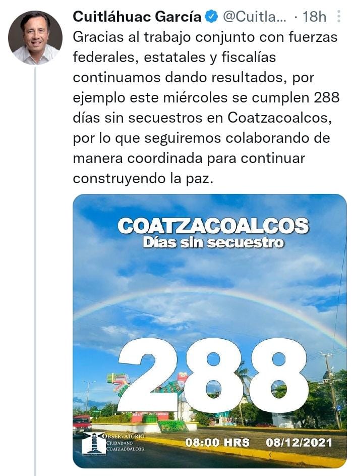 “Resultados que transforman, prueba de ello es que este miércoles se cumplen 288 días sin secuestros en Coatzacoalcos”, se lee en la red social del alto mando policial.