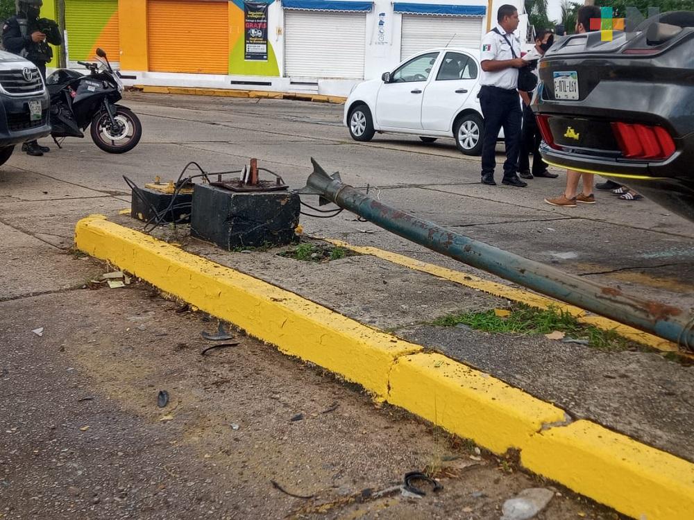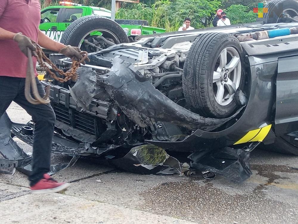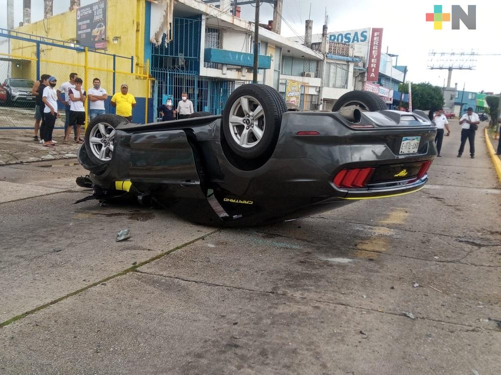 Mustang se impacta contra poste y termina volcado en Coatzacoalcos
