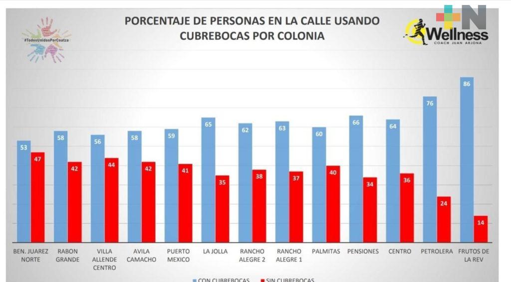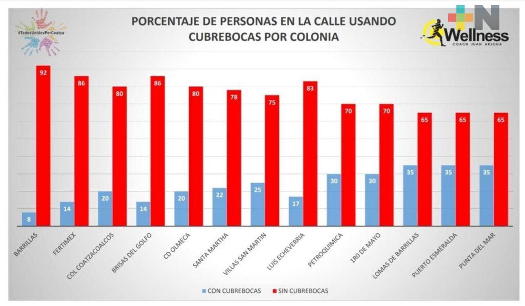 Las colonias con mayor porcentaje que no lo usan son la congregación de las Barrillas 92 por ciento, le siguen Fertimex y Brisas del Golfo con 86, Luis Echeverría con 83, Colonia Coatzacoalcos y Ciudad Olmeca con 80 por ciento, Santa Martha y Villas San Martin con 78 y 75, respectivamente.