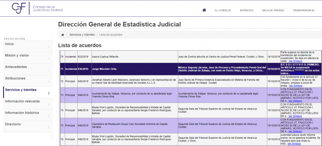 Con fecha del 18 de octubre, la Dirección de Estadística Judicial del Consejo de la Judicatura Federal se dio a conocer que: «se NIEGA la suspensión definitiva a ********** de los actos indicados en el considerando TERCERO, reclamados a las autoridades ahí precisadas, por los motivos ahí expuestos. SEGUNDO. Se CONCEDE la suspensión definitiva a ********** de los actos reclamados indicados en el considerando CUARTO de esta resolución, atribuidos a las autoridades ahí mencionadas, por los motivos y para los efectos precisados en el diverso considerando QUINTO de esta interlocutoria», esto en referencia al amparo 936/2019 del Juzgado Décimo Octavo de Distrito en el que el quejoso es el ex fiscal Winckler Ortíz.