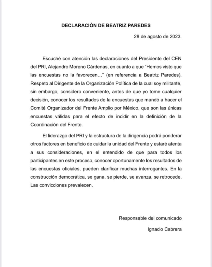 «Escuché con atención las declaraciones del Presidente del CEN del PRI, Alejandro Moreno Cárdenas, en cuanto a que ‘Hemos visto que las encuestas no la favorecen…’ (en referencia a Beatriz Paredes).