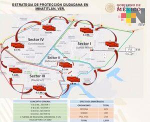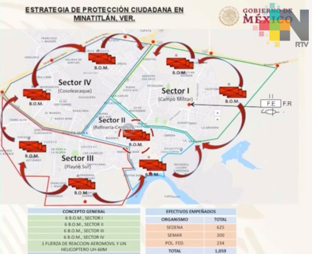 En el evento que encabezó el mandatario federal en el parque Reforma de ese municipio sureño, el secretario de la Defensa Nacional, Luis Cresencio Sandoval detalló que mil 059 elementos darán protección a la población de Minatitlán, Cosoleacaque y también habrá apoyo para Coatzacoalcos, los cuales estarán distribuidos en cuatro sectores.