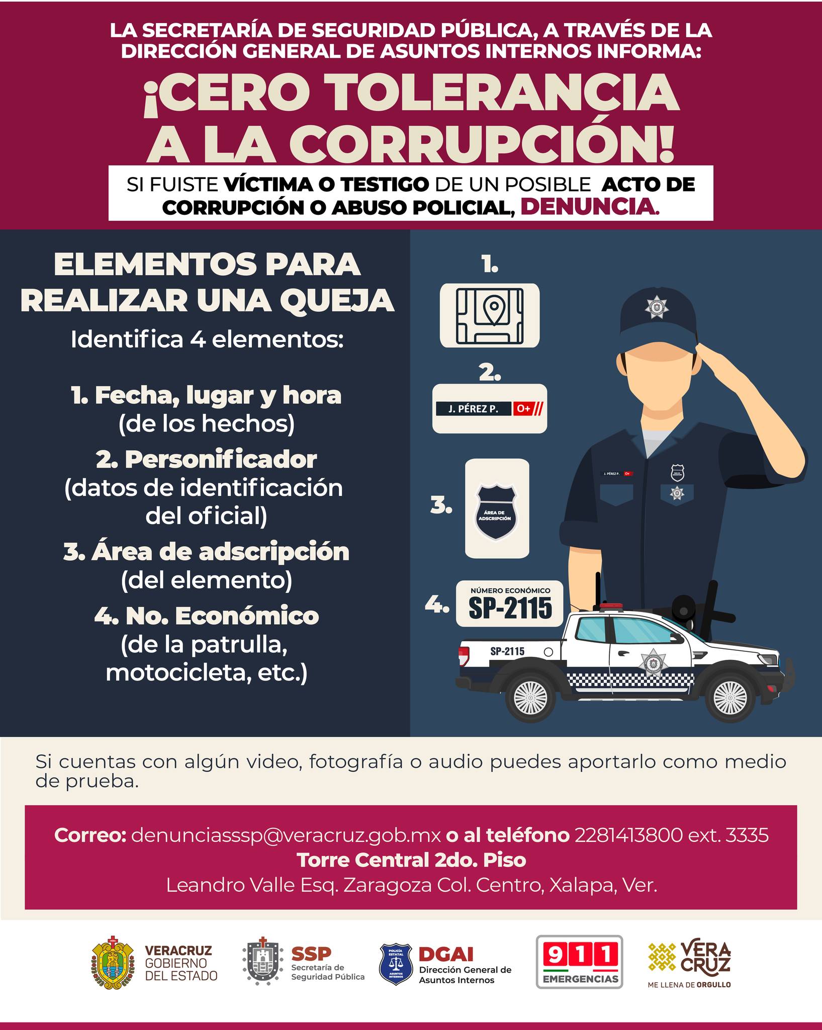 Xalapa, Ver.- La Secretaría de Seguridad Pública del Estado refrenda su compromiso ante la sociedad veracruzana, a través de la Dirección General de Asuntos Internos informa que hay Cero Tolerancia a a Corrupción; invitando a la población a reportar cualquier posible acto de corrupción o abuso policial, invitan a denunciar.