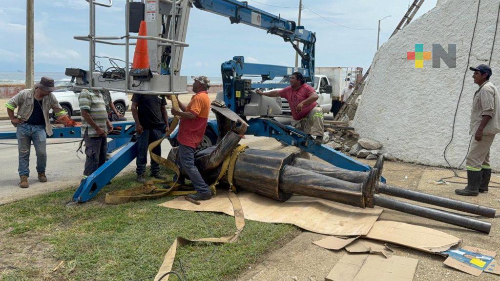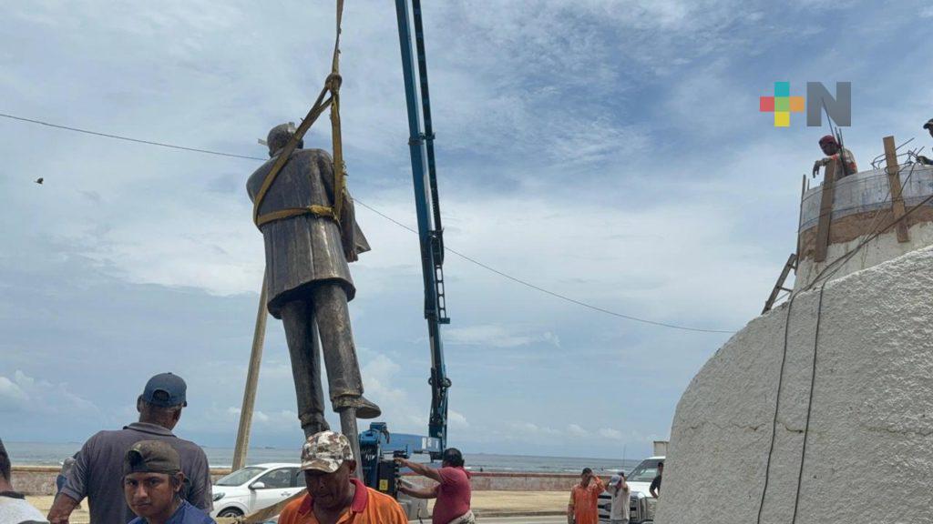 Coatzacoalcos, Ver.- La nueva estatua de Benito Juárez es colocada en el malecón costero y tiene un tamaño aproximado de tres metros de altura, elaborada con un material más resistente para soportar el embate del clima de Coatzacoalcos.